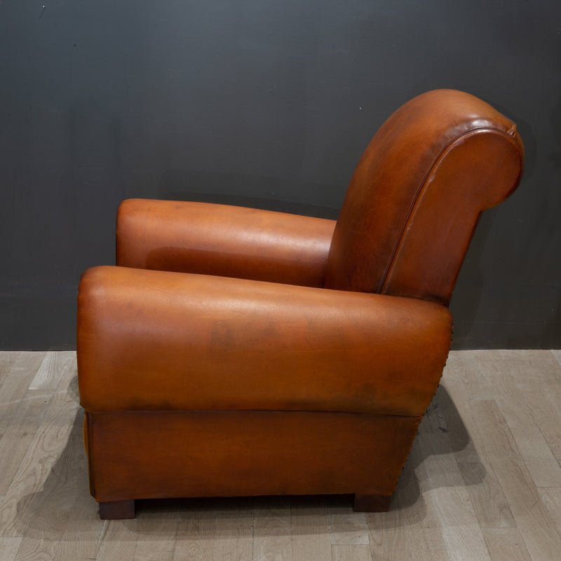 Early 20th c. French rollback sheep hide leather lounge chair with riveted back, wooden feet and rounded armrest. Partially reconditioned. Very comfortable. This chair has retained its original finish with minor blemishes on the leather on the bottom and one arm.